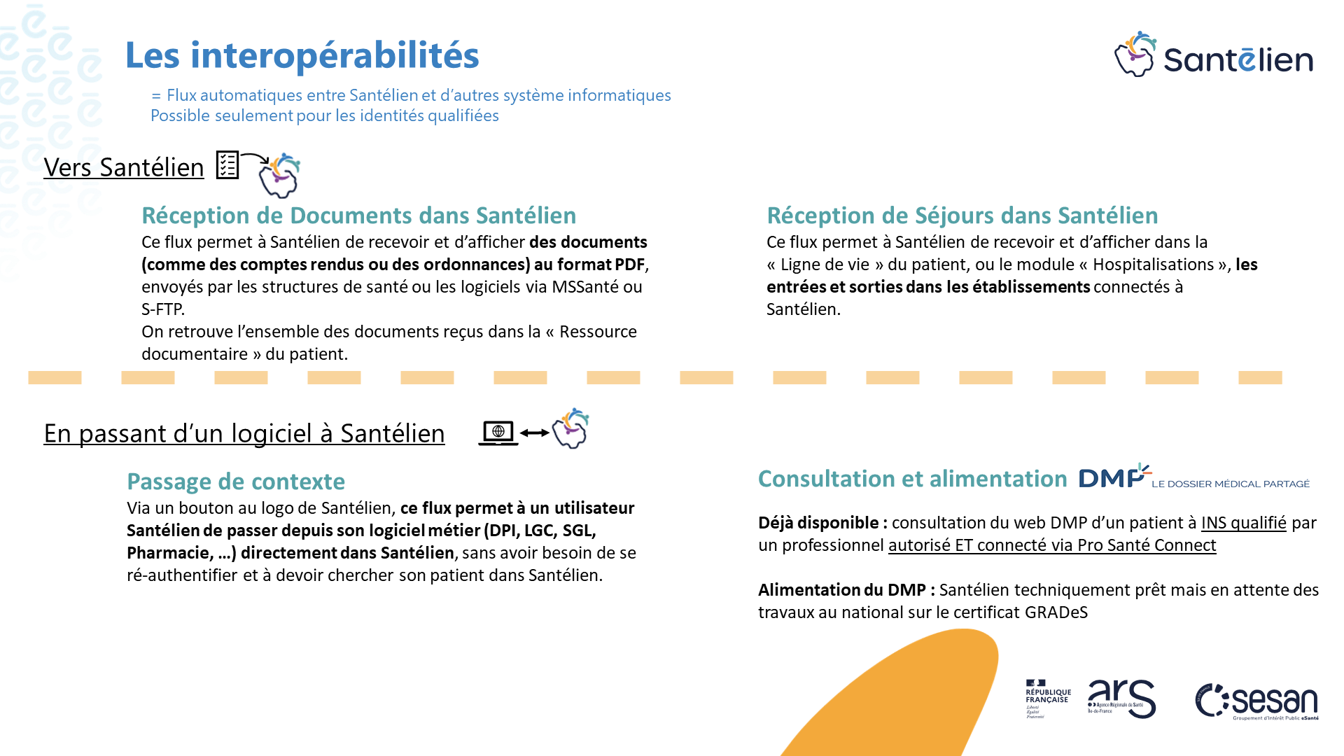 Retrouvez les interopérabilités mises en place ou en cours avec Santélien dans le kit de déploiement mis à jour tous les mois (document: STL-Présentation Interop)